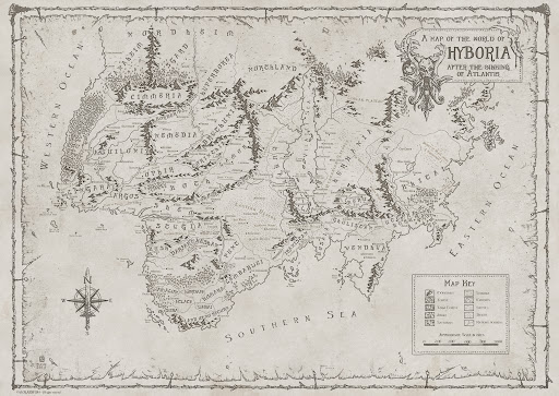 In questo mondo vaga Conan, dipinto a tinte fosche come uomo estremamente violento ma con un codice morale inflessibile. Importantissimo è il mondo in cui Conan vive. Howard stesso fornì ai lettori un numero notevole di cartine da lui stesso disegnate in cui i vari regni sono distribuiti su un continente che per forma e per distribuzione etnica assomiglia al blocco afro-euroasiatico. Cimmeria, il regno in cui è nato Conan è a nord, sopra Aquilonia, la nazione più potente dell’Era Hyboriana. Ma ci sono anche Hyperborea, Nemedia, Brytunia, Stygia e tantissimi altri stati governati da re èer lo più crudeli e totalitaristi. Howard non lascia nulla al caso e ogni popolo ha la propria mitologia. Quella di Conan è semplice ed è alla base della sua morale: Crom è il capo di tutti gli dei. Oscuro e selvaggio lancia sciagure dalla cima della montagna in cui vive. Dona a ogni nato la forza, il coraggio e la volontà per uccidere i propri avversari e odia i deboli. Da qui è facile comprendere l’atteggiamento di Conan nei confronti di un’epoca in cui la corruzione e la decadenza regnano sovrane.