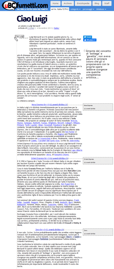 Con poche parole indicava cosa c’era di valido nel multicolore mondo della narrazione e ciò che invece era bluff. Impietoso, certo, schietto ma mai aggressivo. Mai. Non solo: è stato un grandissimo dell’editoria a fumetti. Il suo prodotto si contraddistingueva sempre per la confezione eccelsa. Basta sfogliare una pagina qualsiasi di Nova Express, l’ultima meravigliosa creatura del panorama delle riviste contenitore a fumetti, dove la carta, la grammatura, persino i caratteri dei numeri di pagina erano curati in un modo che non s’era mai visto. “Costa tantissimo un numero di Nova” mi disse una volta al banco di un bar, davanti a un caffè “Troppo” e io gli dicevo “Sì, ma è meravigliosa” e lui sorrideva. Perché voleva questo dalle persone che arrivavano i suoi prodotti: lo stupore negli occhi, il sense of wonder.