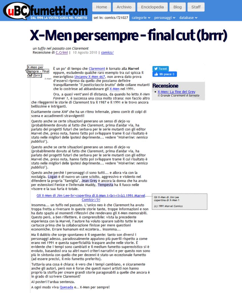 Altro dubbio: tanto son diversi i personaggi attuali che quelli rappresentati da Claremont appaiono più puerili rispetto a come erano nel 1991 e questa superficialità traspare anche nelle storie. È evidente che i tempi sono cambiati e il medium fumetto supereroistico si è evoluto basandosi ora su nuovi ritmi narrativi. Per questo le storie di X-Men Forever non sono più in sintonia col pantheon mutante Marvel, perché tutta la produzione attuale non ha più alcun legame con quello che per decenni è stato un fumetto eccezionale ( parlo da lettore innamorato della saga mutante degli anni che furono ).