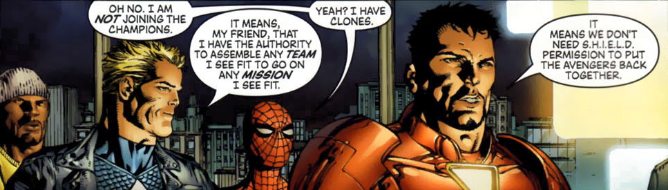 Gli obiettivi principali che si è prefisso Bendis sono così raggiunti: sollevare le sorti economiche degli Avengers in modo definitivo e amalgamare nuovamente l’Universo Marvel dopo lo smembramento in famiglie subito nei primi anni novanta per riportarlo alla primitiva condizione, quella per cui è diventato famoso nei primi anni sessanta. Il quadro di un’operazione di tale portata è finalmente comprensibile. Il restyling è completo anche considerando che a The New Avengers viene attribuito il ruolo che le spetta da sempre: serie centro pulsante dell’Universo Marvel. Nelle sue file è presente l’Uomo Ragno e le collane a lui dedicate sono intrecciate a doppio filo con quelle dei Vendicatori. Anche Wolverine ( Bandis e Straczynski sono bravissimi a riportarcelo iracondo e divertente come nei migliori momenti Claremont/Byrne su Uncanny X-Men o Claremont/Buscema su Wolverine) diventa un elemento portante del gruppo, abbandonando momentaneamente il gruppo originale e trasferendosi nella Stark Tower. Purtroppo Wolverine non viene tutelato dalla Marvel come dovrebbe e lo si trova con psicologie e contesti completamente diversi su altre collane. Ma la miglioria eccellente è che il gruppo è finalmente libero dai suoi legami con il Governo e il Pentagono.