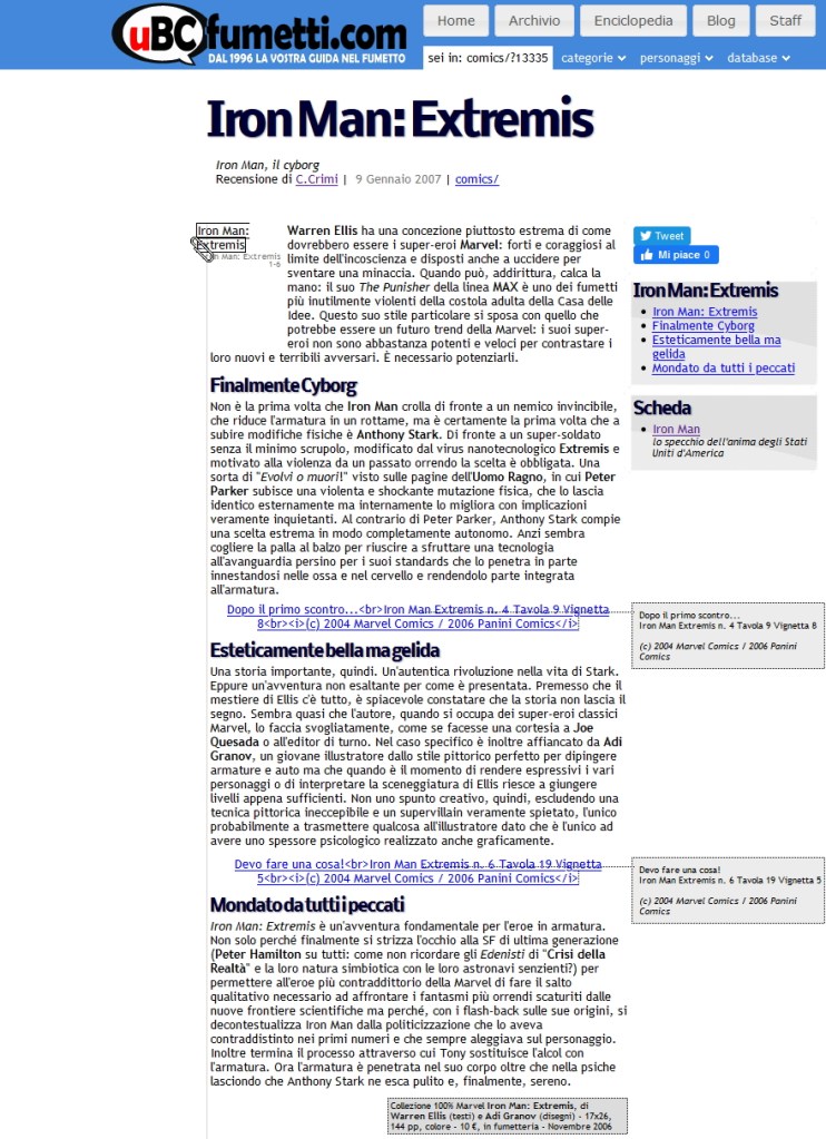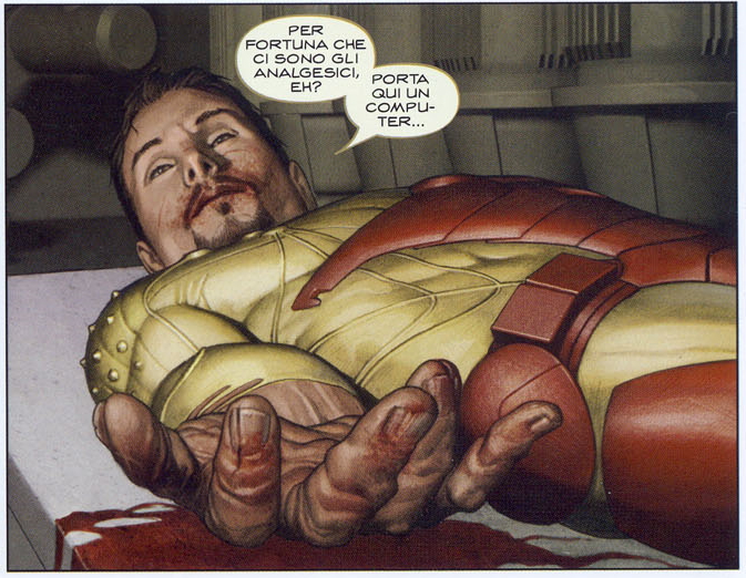 Una storia importante, un’autentica rivoluzione nella vita di Tony Stark e allo stesso tempo un’avventura non esaltante per come è presentata. Premesso che il mestiere di Ellis c’è tutto, è spiacevole constatare che la storia non lascia il segno. Sembra quasi che l’autore, quando si occupa dei super-eroi classici Marvel, lo faccia svogliatamente, come se facesse una cortesia a Joe Quesada o all’editor di turno. Nel caso specifico è inoltre affiancato da Adi Granov, un giovane illustratore dallo stile pittorico perfetto per dipingere armature e auto ma che quando è il momento di rendere espressivi i vari personaggi o di interpretare la sceneggiatura di Ellis riesce a giungere livelli appena sufficienti. Non uno spunto creativo, quindi, escludendo una tecnica pittorica ineccepibile e un supervillain veramente spietato, l’unico probabilmente a trasmettere qualcosa all’illustratore dato che è l’unico ad avere uno spessore psicologico realizzato anche graficamente.