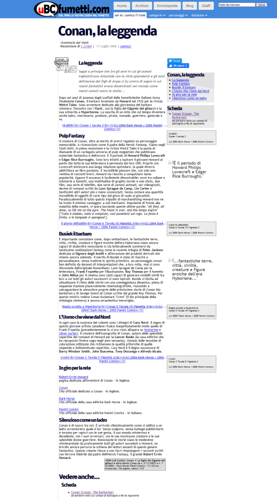 Sono loro infatti a ispirare il giovane Howard al punto che tutta la sua letteratura è permeata dai loro stili. Proprio con Lovecraft intreccerà una lunga relazione epistolare, che diverrà un libro postumo. È incredibile pensare che con solo una ventina di racconti brevi, Howard sia riuscito a conquistare tanta popolarità ma il suo successo è facilmente dimostrabile: solo di Conan nove tra collane e miniserie a fumetti, una moltitudine di graphic novels e one-shots, due film, una serie di telefilm, due serie di cartoni animati, sei videogiochi, decine di romanzi scritti da Lyon Sprague de Camp, Lin Carter e tantissimi altri autori più o meno sconosciuti. Senza contare una quantità incredibile di oggetti di vario tipo dal gioco di ruolo ai giocattoli ( NDA: questo articolo è stato scritto nel 2006: molto altro è stato aggiunto in tutti i campi successivamente a suggellare la notorietà del cimmero ). Paradossalmente di tutta questa notorietà Howard non ne ha tratto il minimo vantaggio: a soli trent’anni, impotente di fronte alla malattia della madre, si spara lasciando queste ultime parole: “All fled, all done, so lift me on the pyre. The Feast is over, and the lamps expire ( Trad: Tutto è andato, tutto è compiuto, così ponetemi sul rogo. La festa è finita, e le lampade si spengono )”.