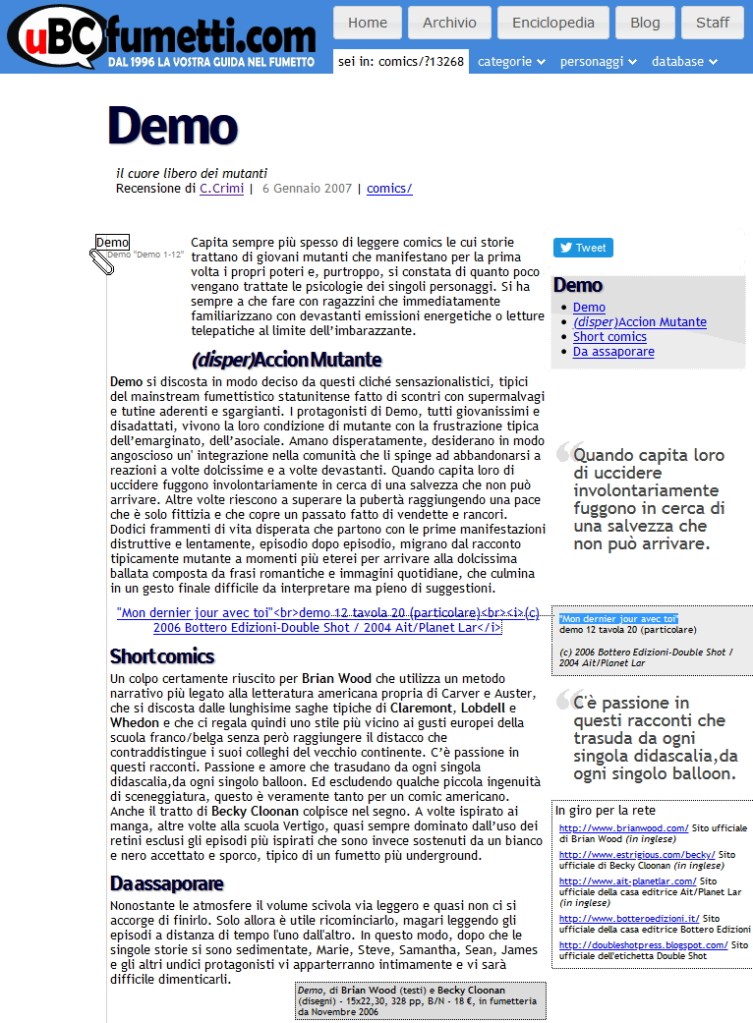 Brian Wood utilizza un metodo narrativo più legato alla letteratura americana propria di Carver e Auster quindi lontanissima dalle lunghisime saghe a cui ci hanno abituato Claremont o Lobdell e che ci regala uno stile più vicino ai gusti europei della scuola franco/belga senza però raggiungere il distacco che contraddistingue i suoi colleghi del vecchio continente. C’è una passione straziante in Demo. Passione e amore che trasudano da ogni singola didascalia, da ogni disegno.