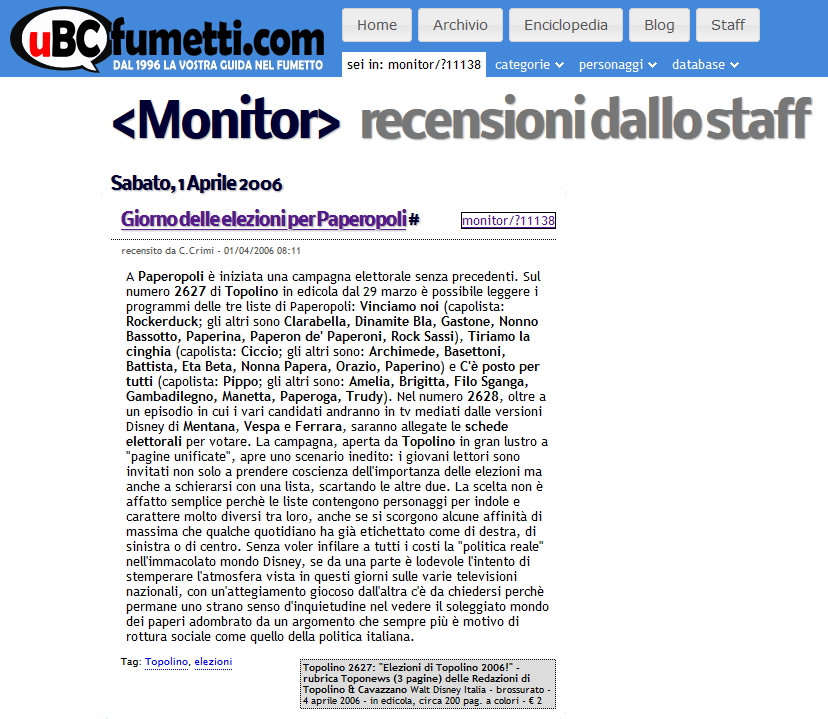 Senza voler infilare a tutti i costi la politica del mondo reale nell’immacolato mondo Disney, se da una parte è lodevole l’intento di stemperare l’atmosfera vista in questi giorni sulle varie televisioni nazionali con l’attegiamento tipicamente giocoso dei personaggi Disney dall’altra c’è da chiedersi perché permane uno strano senso d’inquietudine nel vedere il soleggiato mondo dei paperi adombrato da un argomento che sempre più è motivo di rottura sociale come quello della politica italiana.