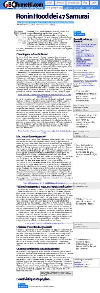 Ho fatto fatica ad acquistare Ronin Hood dei 47 Samurai perché il titolo attrae poco, tanto sa di parodia ma superate le prime pagine ho trovato immediatamente lo spirito di questa storia che conoscevo per aver letto La storia dei 47 ronin di George Soulié de Morant. L’operazione di Amano è meritevole perché affronta il tema dell’onore e dei samurai con l’ottica tipica della tradizione giapponese, un popolo che è sulla bocca di tutti ma che pochi conoscono realmente.