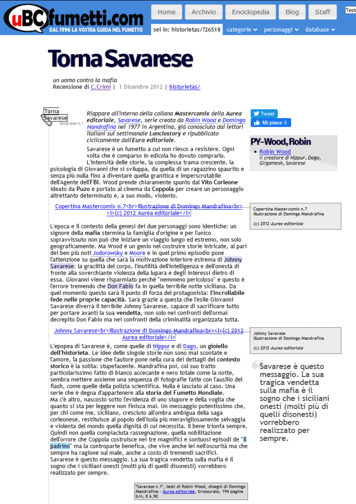 L’epopea di Savarese è, come quelle di Nippur e di Dago, un gioiello dell’historieta. Le idee delle singole storie non sono mai scontate e l’amore, la passione che l’autore pone nella cura dei dettagli del contesto storico è la solita: stupefacente. Mandrafina poi, col suo tratto particolarissimo fatto di bianchi accecanti e neri totali come la notte, sembra mettere assieme una sequenza di fotografie fatte col flash. Nulla è lasciato al caso. Un’ opera che è degna d’appartenere alla storia del Fumetto Mondiale.