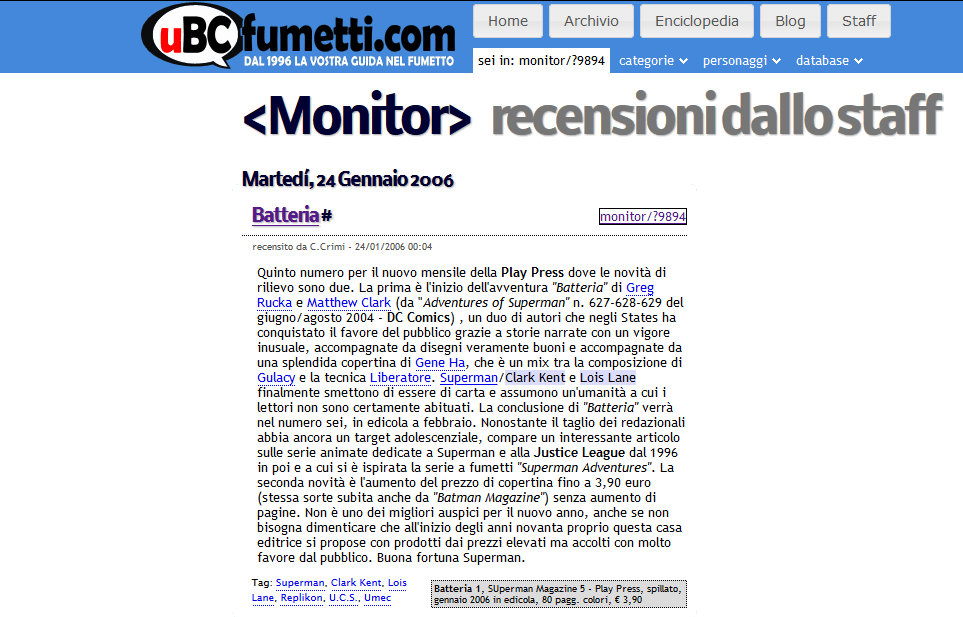 Quinto numero per il nuovo mensile della Play Press dove le novità di rilievo sono due. La prima è l’inizio dell’avventura Batteria di Greg Rucka e Matthew Clark (da Adventures of Superman numeri 627, 628 e 629 pubblicati da giugno ad agosto 2004 dalla DC Comics), un duo di autori che negli USA ha conquistato il favore del pubblico grazie a storie narrate con un vigore inusuale, illustrate da disegni eccellenti e accompagnate da una splendida copertina di Gene Ha che, per l’occasione, sfoggia uno stile che richiama Paul Gulacy e la tecnica pittorica di TaninoLiberatore. Superman/Clark Kent e Lois Lane finalmente smettono di essere di carta e assumono un’umanità a cui i lettori non sono certamente abituati. La conclusione di Batteria verrà pubblicata nel numero sei, in edicola a febbraio. Nonostante il taglio dei redazionali abbia ancora un target adolescenziale, compare un interessante articolo sulle serie animate dedicate a Superman e alla Justice League dal 1996 in poi e a cui si è ispirata la serie a fumetti Superman Adventures. La seconda novità è l’aumento del prezzo di copertina fino a 3,90 euro ( stessa sorte subita anche da Batman Magazine ) senza aumento di pagine. Non è uno dei migliori auspici per il nuovo anno, anche se non bisogna dimenticare che all’inizio degli anni novanta proprio questa casa editrice si propose con prodotti dai prezzi elevati ma accolti con molto favore dal pubblico. Quindi… buona fortuna Superman Magazine.